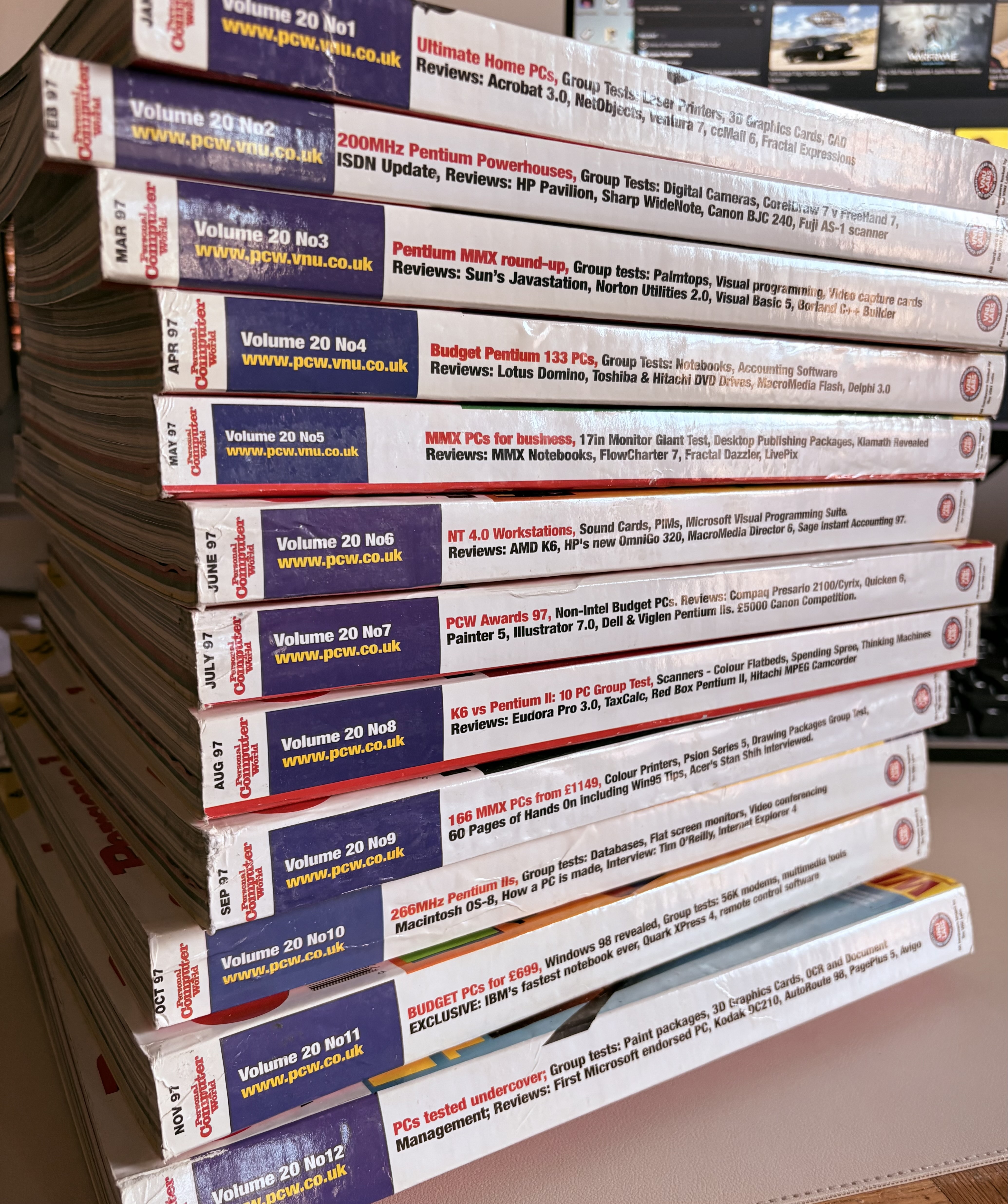 And I picked up something new: all 12 issues of Personal Computer World from 1997. This isn't a games magazine, it's a business/enthusiast publication, and has a ludicrously high page count, largely due to the myriad multi-page adverts that constitute the vast majority of its contents. These twelve issues weigh—I kid you not—a combined 17 kilograms. The December issue alone is over 900 pages; in most other magazines, that would be 6–10 issues worth! They're full of foldouts and variable page sizes, are going to pose an inordinately complex scanning challenge, and will be useful to approximately nobody. I can't wait to get going with these stupid things.