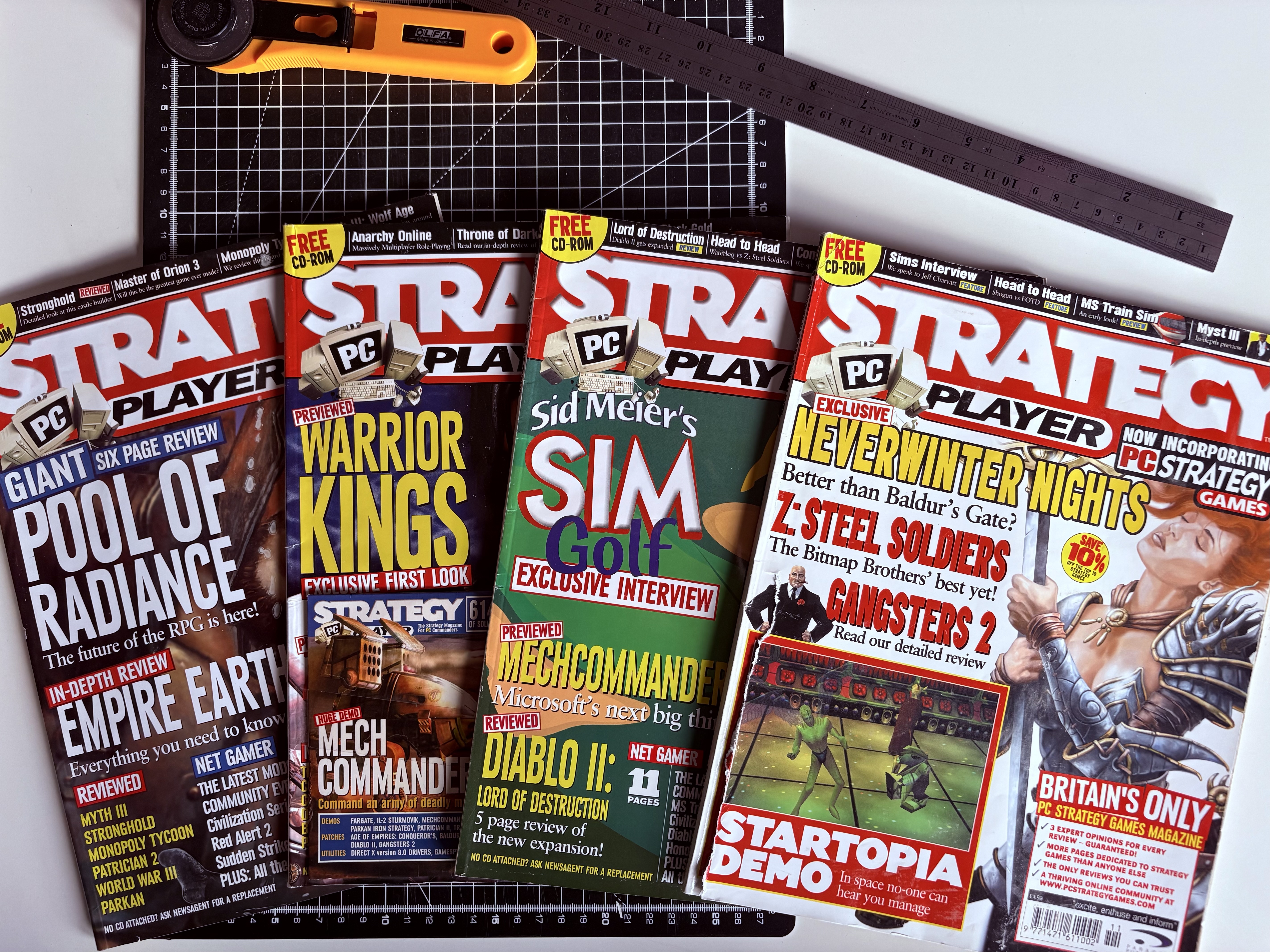 Then I started the year attacking (finally) the small pile of PC Strategy Games I've had since last summer, scanning and uploading the first and second issues. These magazines are getting the works: a slow and careful debind, full two-sided scanning (with no document feeder), methodical deskew and spot healing, and uploads to archive.org (including raw unedited images), RetroMags (once they send me upload credentials) and OldGameMags. I didn't time it, but getting each of these issues online easily took a double-digit number of hours.